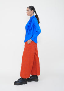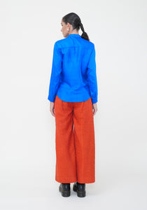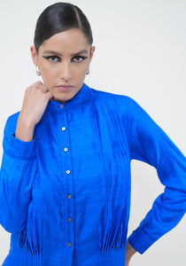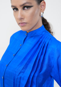 Hand-woven silk button-down shirt with pleated waist to give shape. Full sleeves end in button-down cuffs. Band collar.