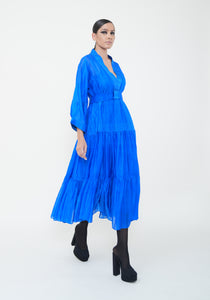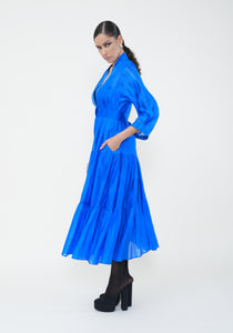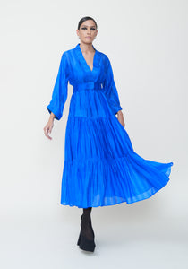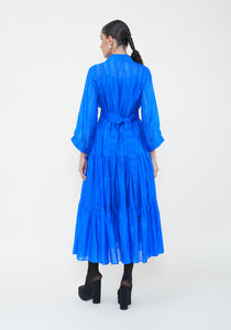 Hand-woven silk self stripe tiered dress. V-neck. 3/4th sleeves. Belt to adjust shape. Cotton slip included.