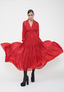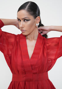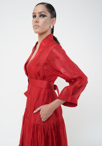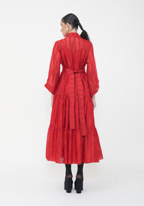 Hand-woven silk self stripe tiered dress. V-neck. 3/4th sleeves. Belt to adjust shape. Cotton slip included.