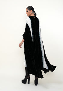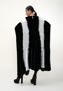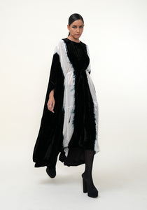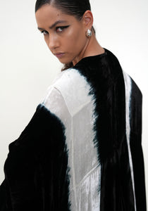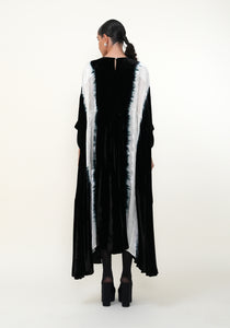 Woven silk/viscose velvet asymmetric hem dress with tie-dye patterning. Round neck with slit at back.