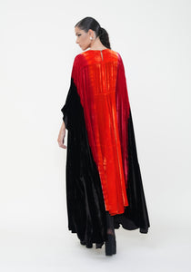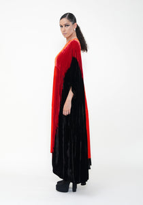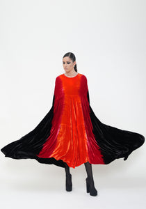 Woven silk/viscose velvet asymmetric hem dress with tie-dye patterning. Round neck with slit at back.