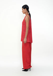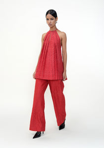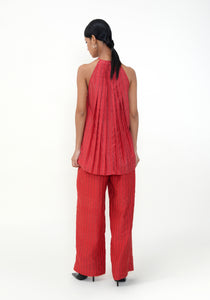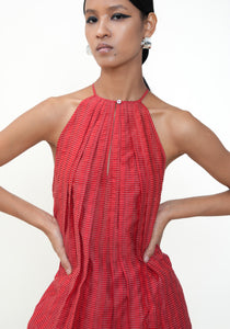 Hand-woven checkered silk/cotton halter neck sleeveless shirt. Round neck leads into a slit with single button-loop fastening in the front.