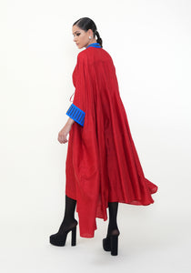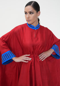 Hand-woven silk oversized asymmetric hem dress. 3/4th sleeves. Belt to adjust shape. Band collar and cuffs detailed with hand-embroidered glass beads. Cotton slip included.