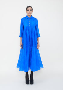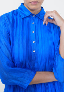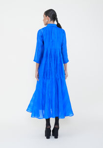 Hand-woven self stripe silk pleated yoke tiered dress. Shirt collar leads into a button-down placket which ends at the waist. Three fourth sleeves. Pockets lie inseam at the waist. Cotton slip included.