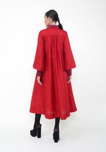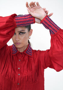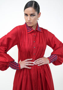 Hand-woven silk pleated waist shirt dress. Regular collar leads into a button-down placket that stops at the waist. Pockets lie inseam on either side at the waist. Full sleeves end in wide button-down cuffs. Hand-embroidered glass beads detail on collar and cuffs.