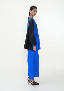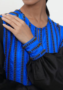 Hand-woven silk pleated yoke colour block panelled shirt with hand-embroidered glass beadwork. Round neck with single button-loop fastened slit in the front. Full sleeves end in button down cuffs.