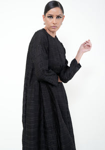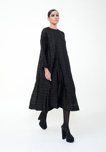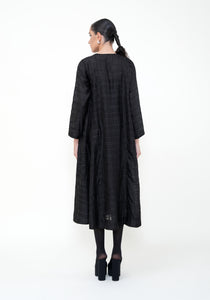 Hand-woven ultrafine silk panelled dress. Wavy pleat surface texturing with metallic thread. Round neck with slit in front. Pockets lie inseam on either side at the waist. Full sleeves. Cotton slip included.