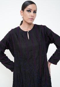 Hand-woven silk halter neck maxi dress with all over hand-embroidered glass beadwork. Cotton slip included.