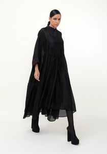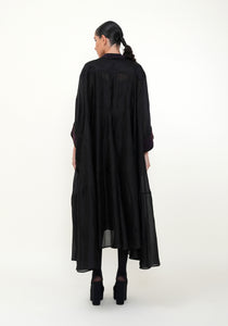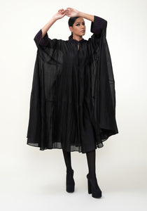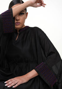 Hand-woven ultrafine silk oversized asymmetric hem dress. 3/4th sleeves. Belt to adjust shape. Band collar and cuffs detailed with hand-embroidered glass beads. Cotton slip included.